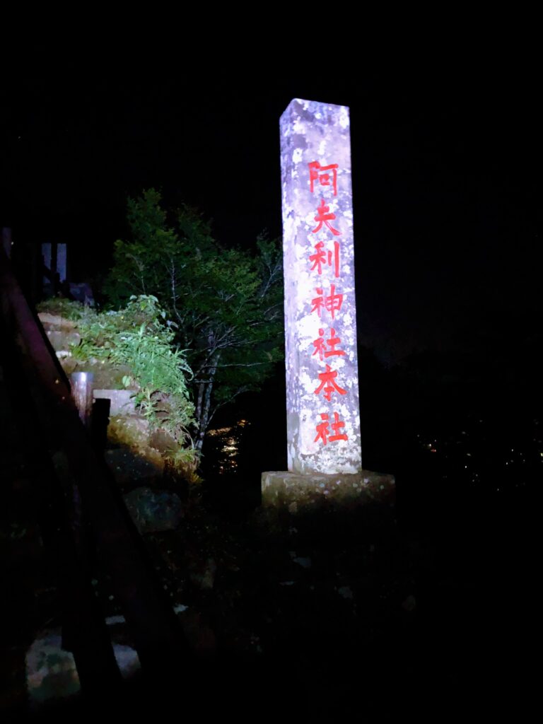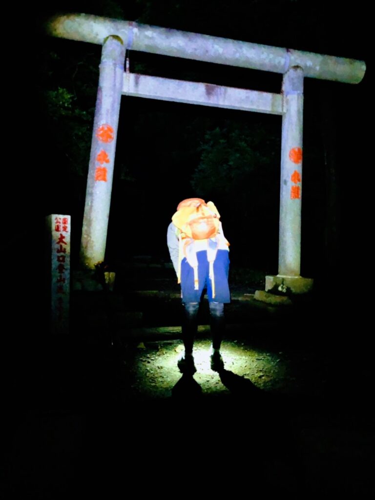 〈最後の目印〉「 二十八丁目 」に到着。暗闇の中、石造りの鳥居が浮かび上がり、阿夫利神社本社であることを教えてくれます。一礼して、本社内へ向かいます!