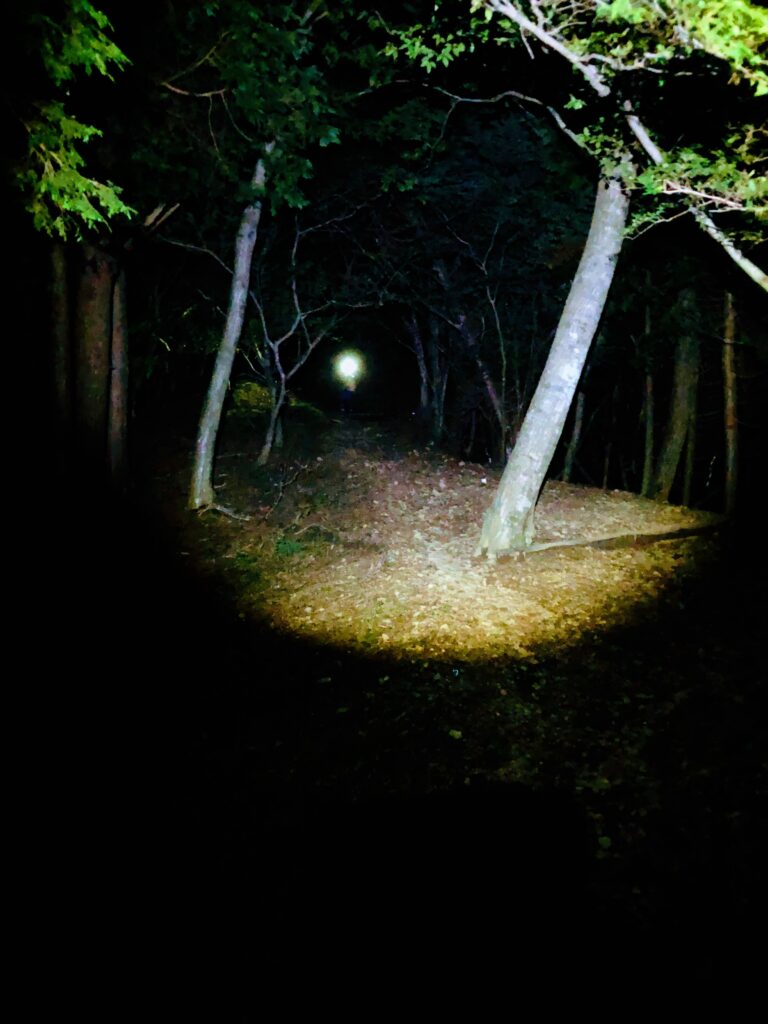〈暗闇の中を登る〉 山頂までの昼間の標準コースタイムは上りで1時間20分と初心者向け。途中に鎖場があるものの、要所には道標もしっかりあって道迷いの危険性も少なく、登山未経験者でもチャレンジしやすい穴場の登山ルートですが、ナイトハイクとなると状況は一転します。 夜、山の中に一歩進むと一面に暗闇が広がり、ヘッドライトの明かりだけが頼りです! 足元の状況をしっかり確認しながら、慎重に足を進めます!