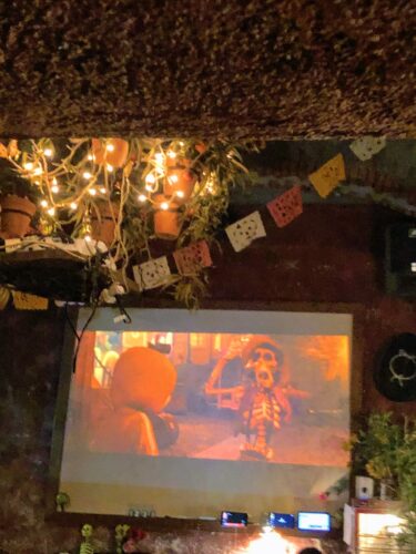 メキシコ料理の名店 《フォンダ・デ・ラ・マドゥルガーダ》 雰囲気は本場メキシコそのもの。 地下三階では大型プロジェクターにディズニーのメキシコ映画『リメンバー・ミー』を映し出しムードを盛り上げます。
