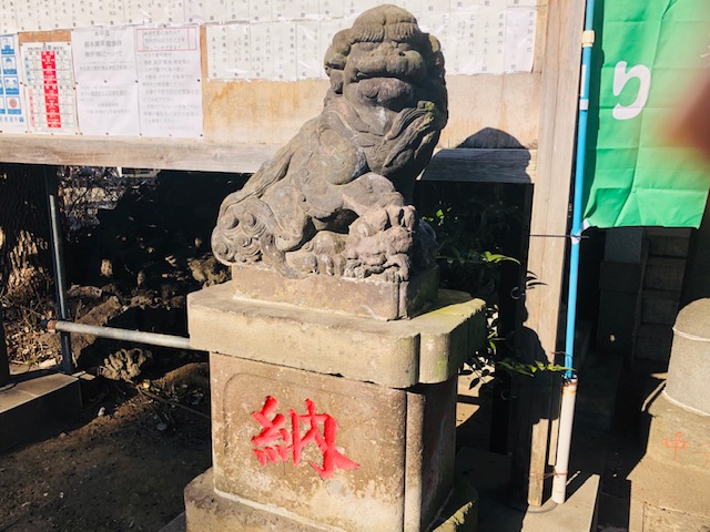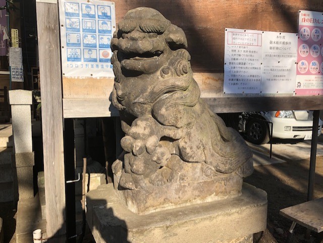 こちらの狛犬さん。どちらの狛犬さんの足元にも子供がいます。右側の阿形は子に乳を与えている、少し珍しい造形のメスの狛犬です。(写真では見ずらくてすみません。)