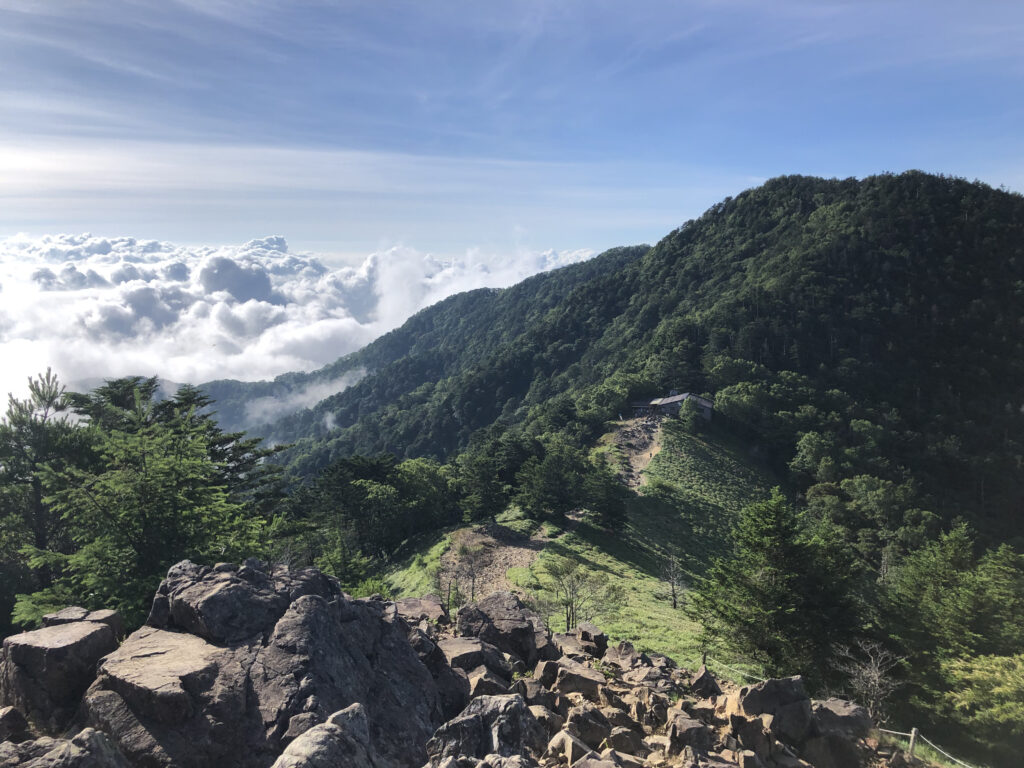 〈眼下に広がる稜線と雲海〉 岩場を下った稜線の先には、介山荘が見えます。