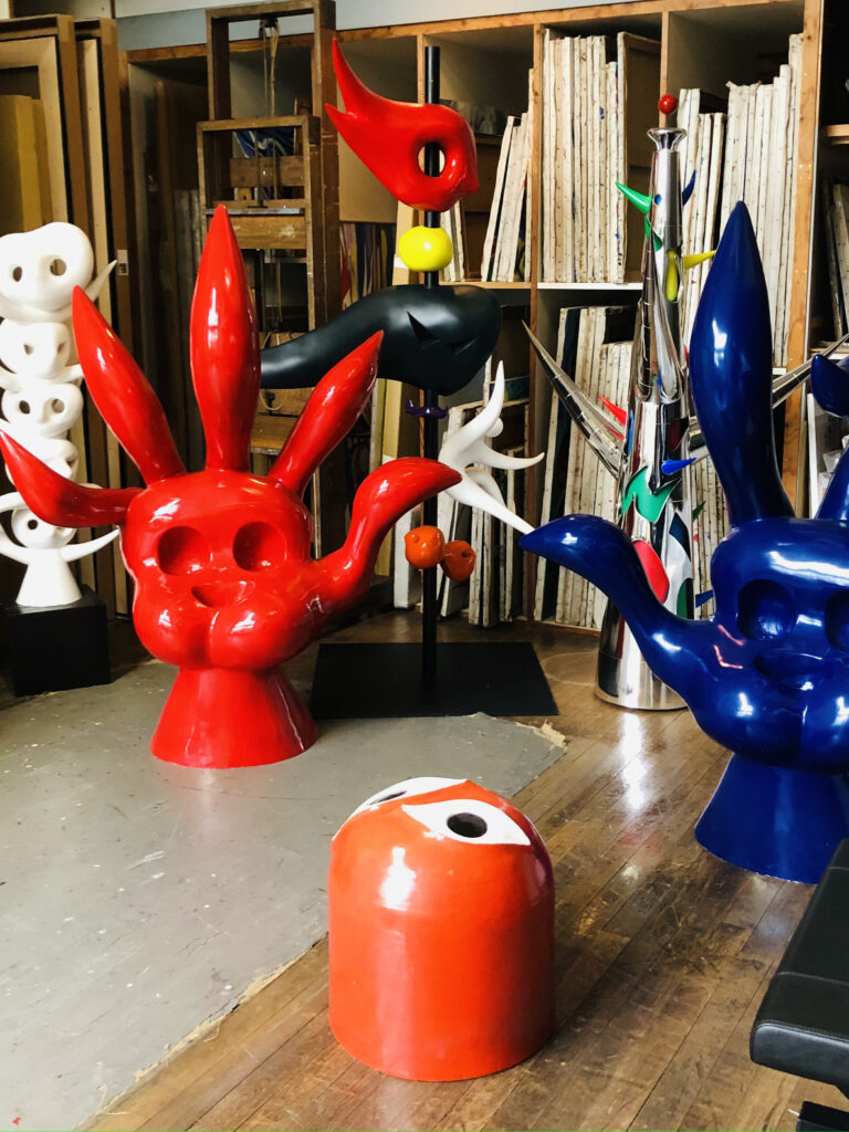 〈赤い手と青い手のオブジェ〉 神奈川県相模原市 西門商店街に、設置されています。 「宇宙をつかみ、客を呼ぶ」意味の込められたオブジェ、現物は高さが4mもの大きさにもなります。 岡本太郎曰く、「芸術を暮らしのなかに届けたい」とのこと。 手前が1963年の作品でk《坐ることを拒否する椅子》信楽で焼かれた陶製の椅子です