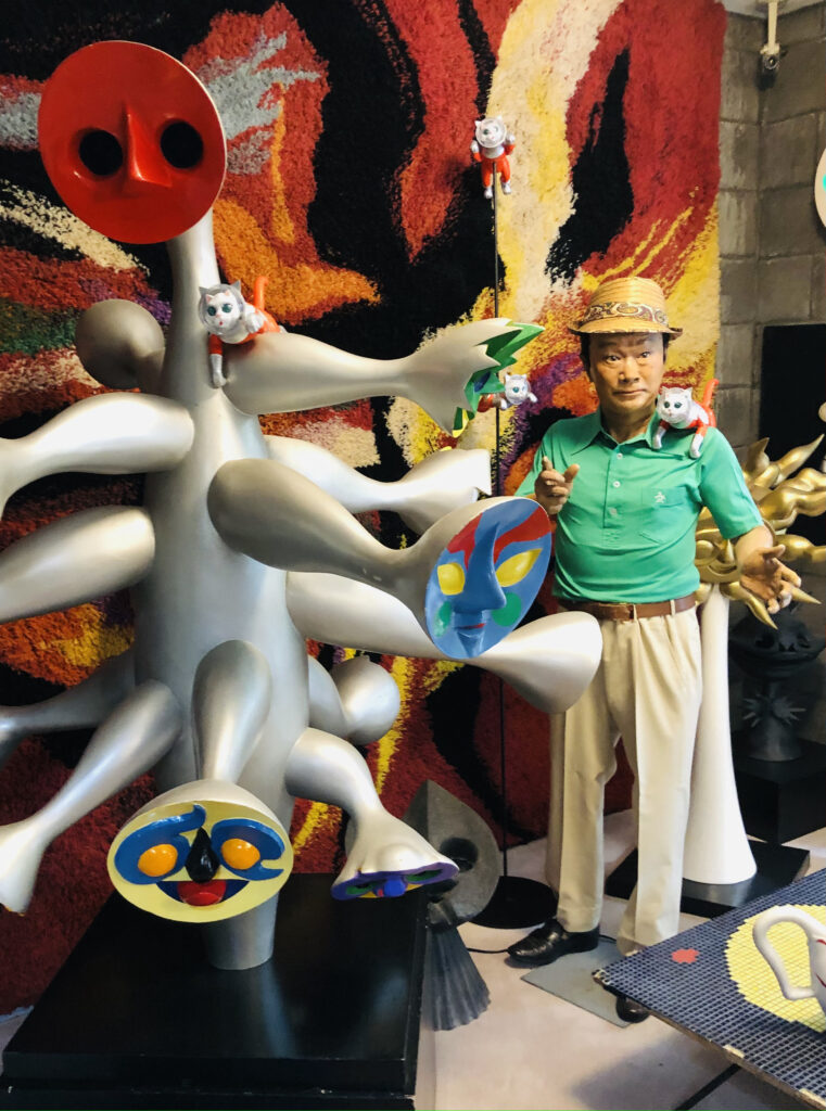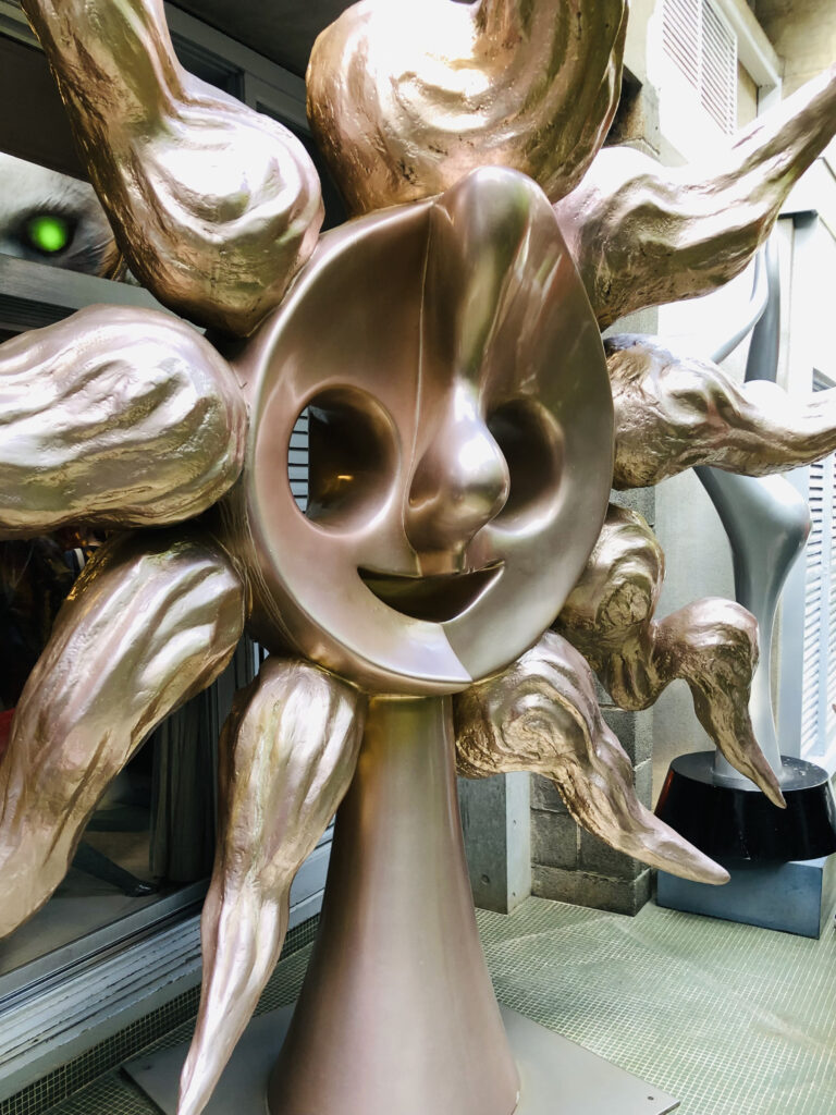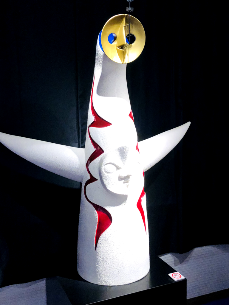 〈こどもの樹〉 表参道駅近くの青山通りに面する国立総合児童センター「こどもの城」は2015年に閉鎖されました。そのシンボルとして作られた高さ7.5m、幅5.2mの像の縮小版オブジェ。 「人間はその数だけ、それぞれ、その姿のまま、誇らしくなければならない」という岡本太郎の言葉が背景にあり、文化や人種の問題を超えた超えた子供の尊重を訴えている作品と言われています。建物は2029年ごろまでには、東京都が複合施設に建て替える予定ですが、〈こどもの樹〉破損ぞ期予定です。 右は岡本太郎本人のオブジェ。 身長156cm小柄な方でした。