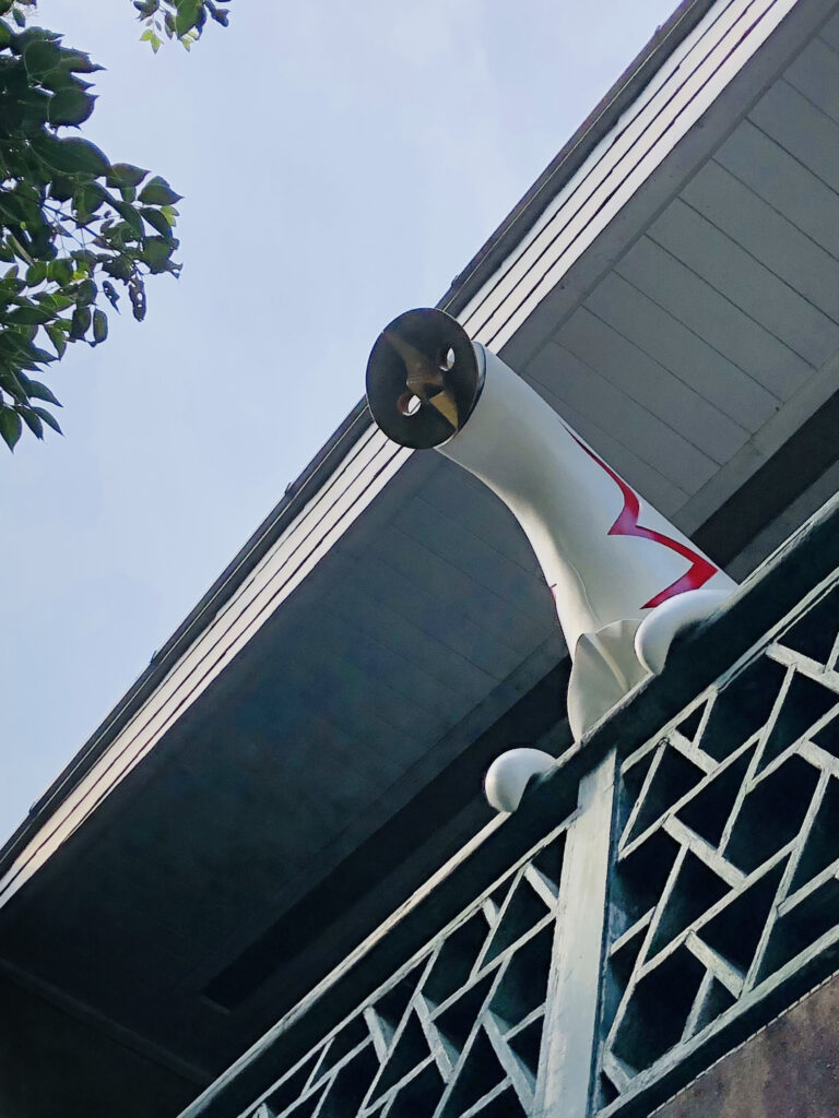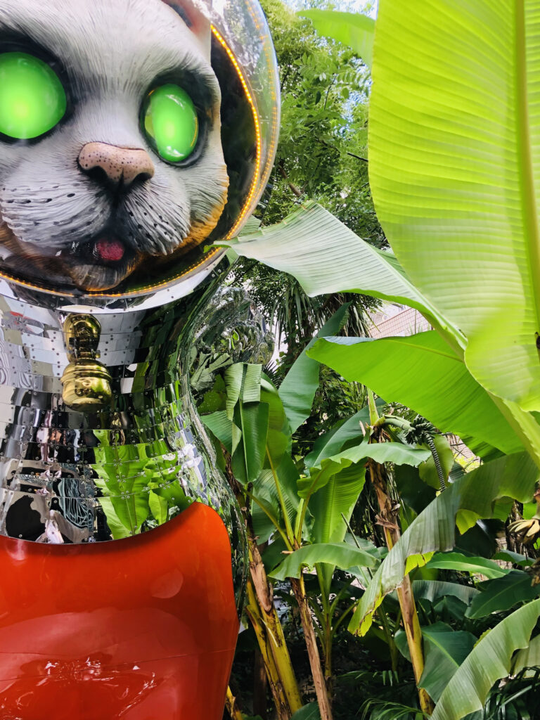 〈シップス・キャット(船乗り猫)〉 庭には岡本太郎作品とともに、これまでのシリーズで1番大きい《SHIP’S CAT》ヤノベケンジの作品が展示されています。  船乗り猫とは、船乗りたちが長い航海に出る間に船上で飼われる猫を指し、ネズミの被害から貨物や船を守るとともに、船乗りたちに癒しをもたらす存在でした。  ヤノベ氏は船乗り猫をモチーフに、《SHIP’S CAT》を「若者や人々の旅や冒険を守り、地域に幸福を運ぶ巨大な猫、未来に立ち向かう姿を作品」として制作しているそうです。