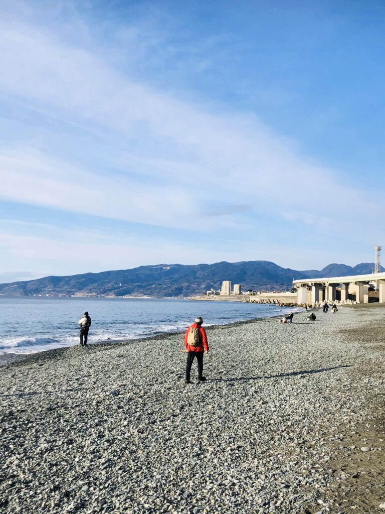〈早朝の海岸を歩む〉 釣り人を横目に、海の向こうが箱根の山々です。