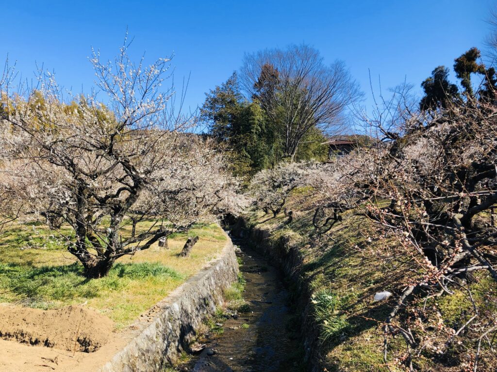 〈用水路と梅〉 城前寺付近まで降りてきました。