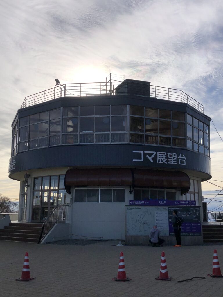 〈コマ展望台〉 早朝のため開店していませんが、ケーブルカー直営店です。 筑波山頂駅の隣にあり、1階が売店、2階が展望食堂、3階が屋上展望台となっています。2階の客席は360°のパノラマを楽しみながらお食事ができる展望レストランです。