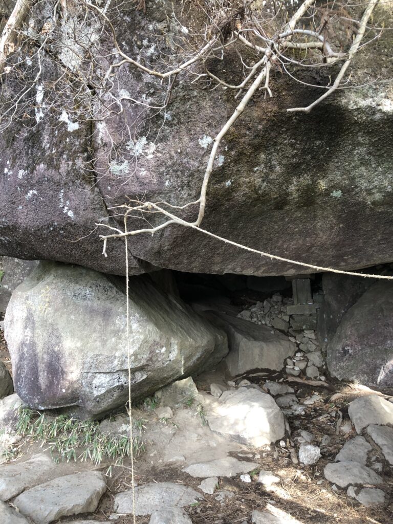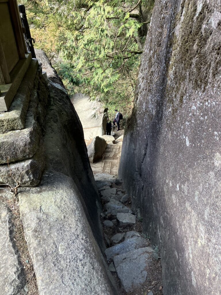 〈母の胎内くぐり〉 筑波山禅定(修験の行)の行場の一つ。岩を抜けることで、罪穢れの無い清い心身に立ち返ることを意味しています。 狭い空間ですが、皆で潜り抜けてみました!