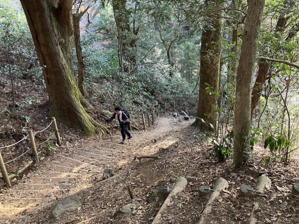 〈山中の木製階段を登る〉 筑波山神社からスタートし、まずは男体山のピークを目指します。御幸ヶ原コースはケーブルカー沿いのコースで、比較的急勾配です。