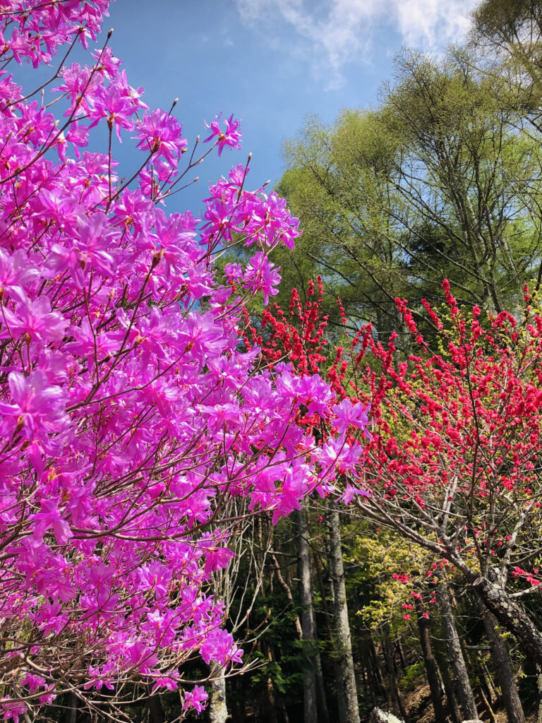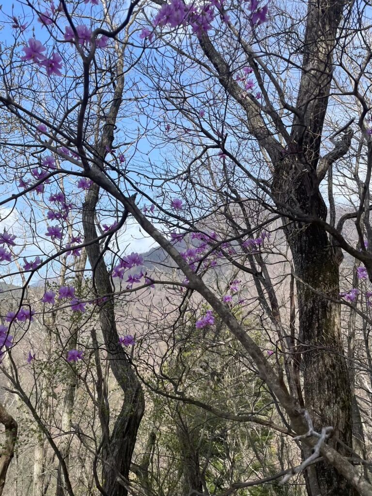 〈ミツバツツジ〉 下山時に、目についたピンクの美しい花がミツバツツジ。 花期は4 – 5月。 本州の関東地方、東海地方、近畿地方東部の太平洋側に分布し、主に山地や丘陵地のやせた尾根や岩場、里山の雑木林などに生育するそうです。 葉が3枚輪生することから、名の由来になっています。