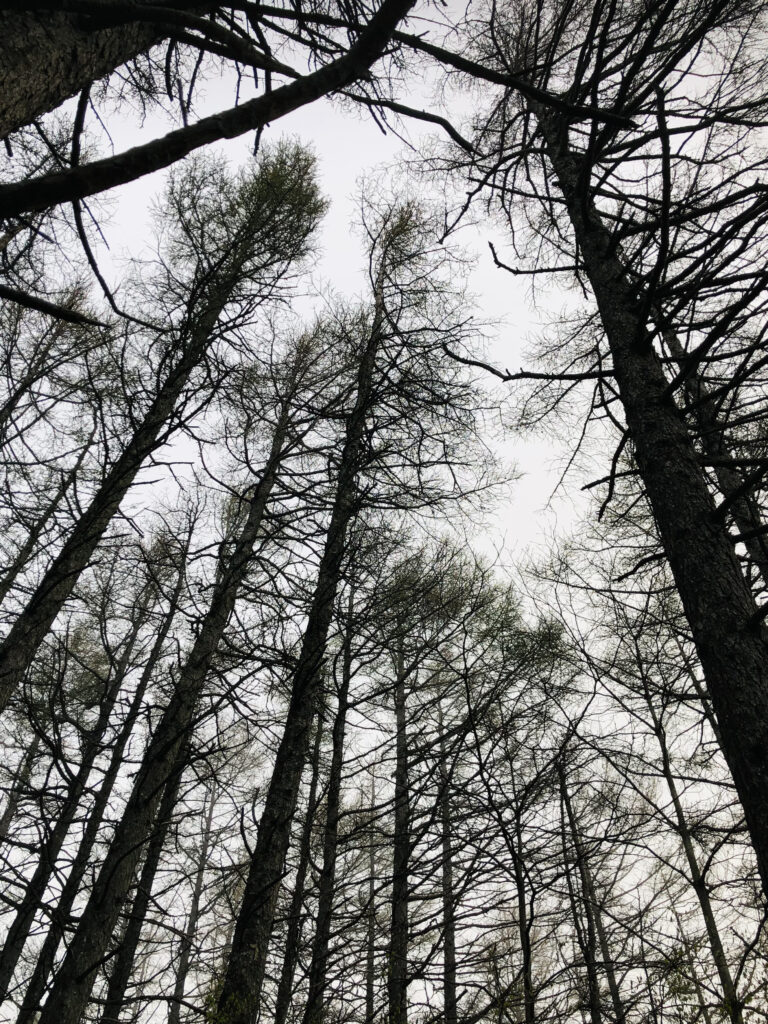 〈早朝の樹林帯を歩む〉 早朝の樹林帯を登ります。 天気はあいにくの曇り空。 湿度が高く、どんよりしています。