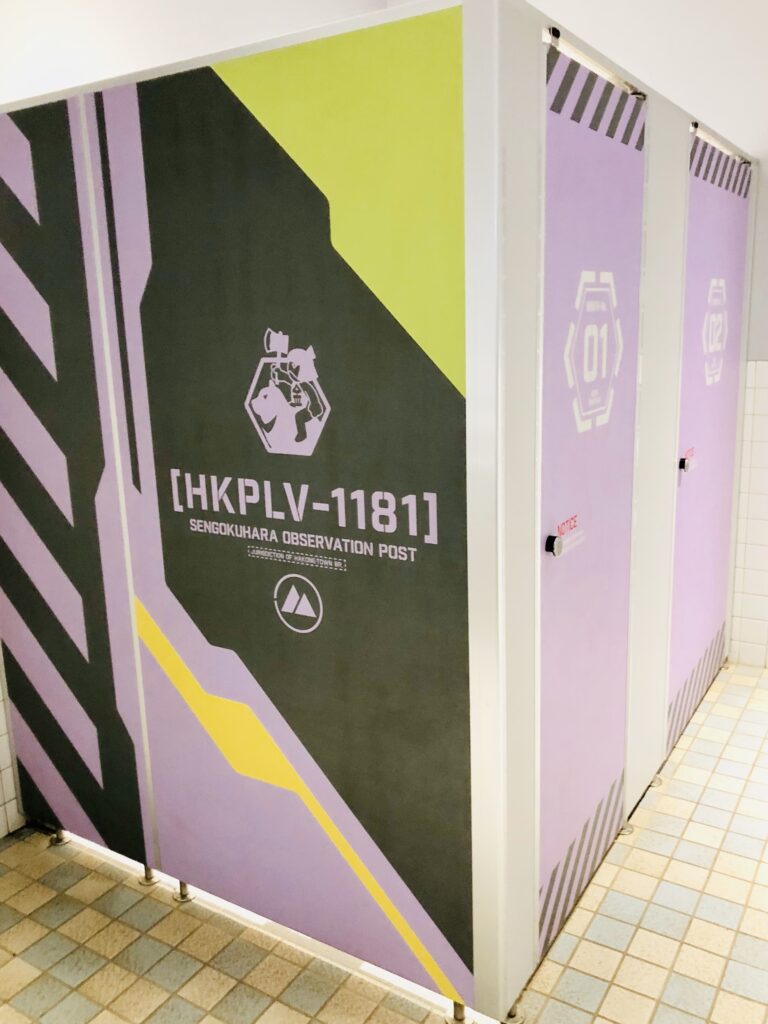 〈男子トイレ内部〉仙石原前哨基地の部隊マークには、金時山や公時神社をイメージソースに「クマに乗った金太郎」がデザインされていました! 部隊番号の「1181」は、金時公園の所在番地に由来しているそうです。