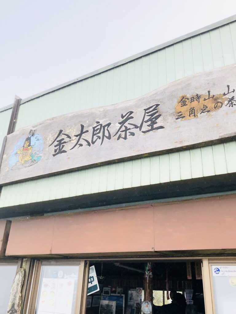 〈金太郎茶屋〉 霧の中の登山。 頂上の金太郎茶屋に到着しましたが、残念ながら雲晴れず。