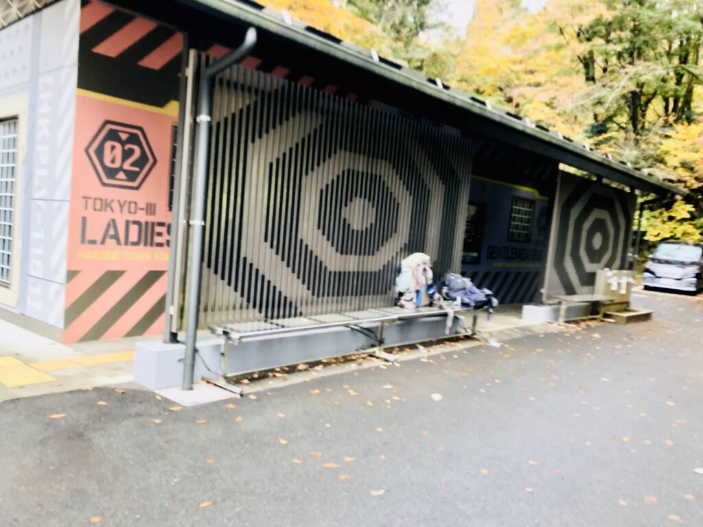 〈集合場所の金時公園駐車場〉 併設している金時公園トイレは、エヴァンゲリオンの劇中において使徒と戦う国連直属の非公開組織・特務機関NERVが秘密裏に建設した「仙石原前哨基地(SENGOKUHARA OBSERVATION POST)」というイメージでデザインしいるそうです。