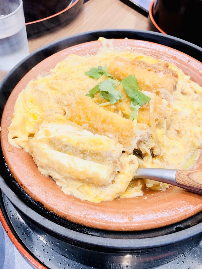 〈名物 豆腐かつ煮定食〉 豆腐にジューシーな国産豚ひき肉を挟んで揚げた後、土鍋で煮込んだかつ煮です!