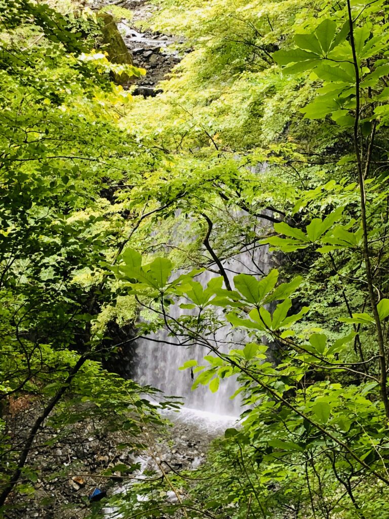 〈滝とマイナスイオン〉 雲に隠れて、太陽は中々か顔を出してくれません。今日の雲は厚い。