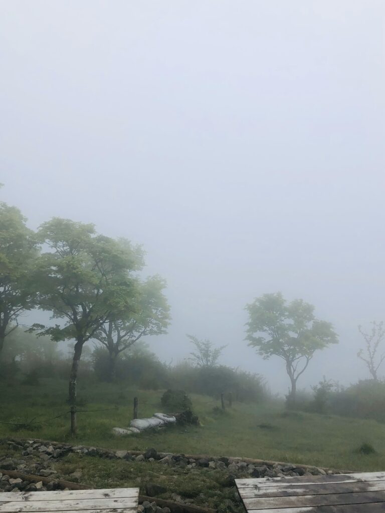 〈鍋割山頂上〉丹沢山系のひとつの山に数えられている鍋割山。ずっーとガスの中、ブナの林を歩きます。気づくと・・・・。そこは頂上でした(笑)。