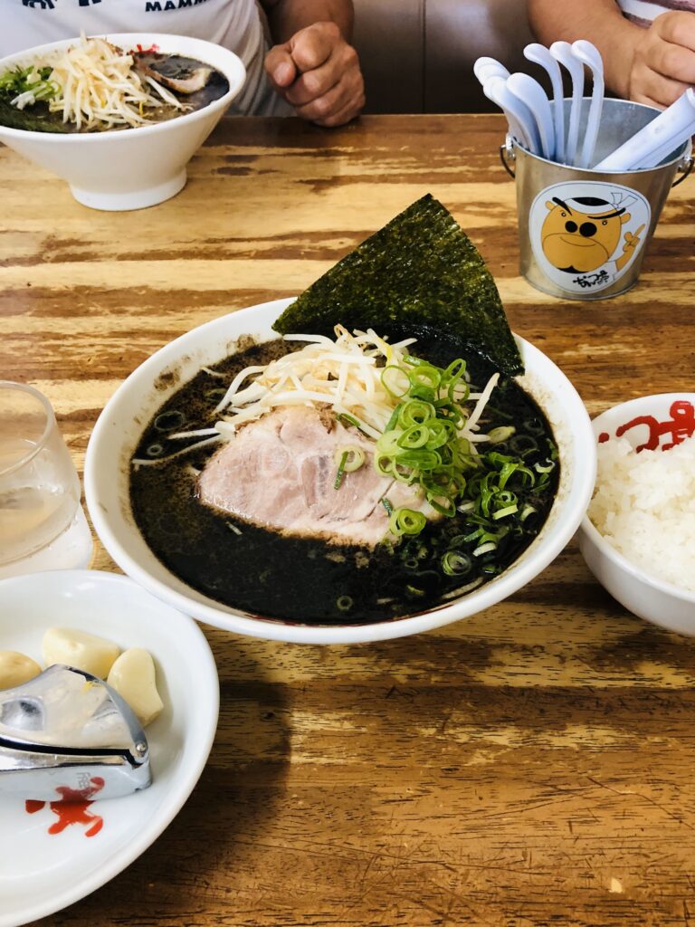 〈なんつッ亭 本店〉 下山して向かったのは、なんつッ亭 本店。濃厚なとんこつスープに浮かぶ芳ばしいマー油の香り。そして特製ちゃーしゅー。初めてなんつッ亭のらーめんを目にした方はその黒いスープに驚くことでしょう!
