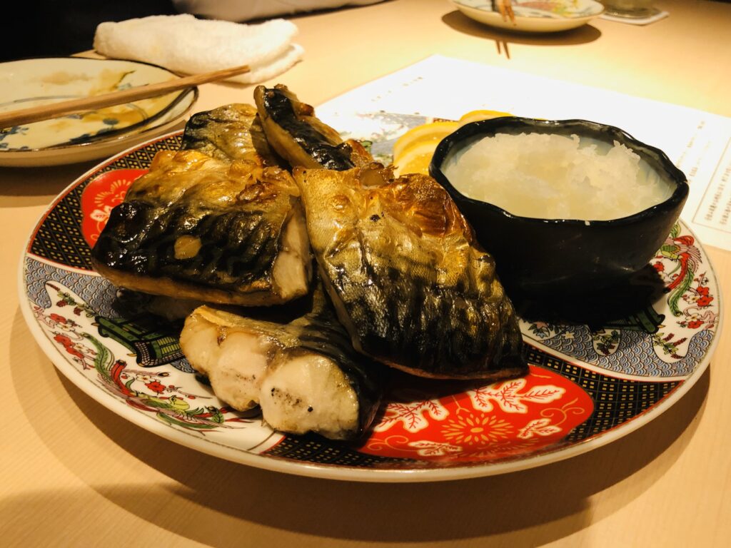 〈⼤トロ鯖の炉端焼き〉 一度干すことでサバの旨味が凝縮されています! 大根おろしと一緒に口にすると、めちゃくちゃ美味しいです!