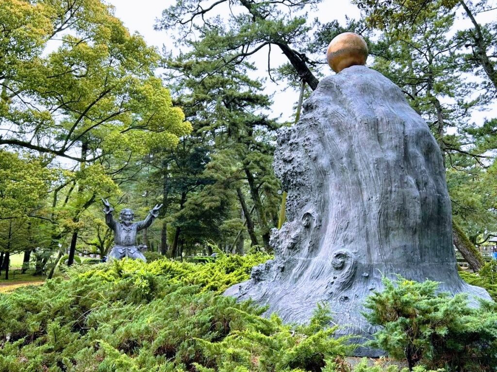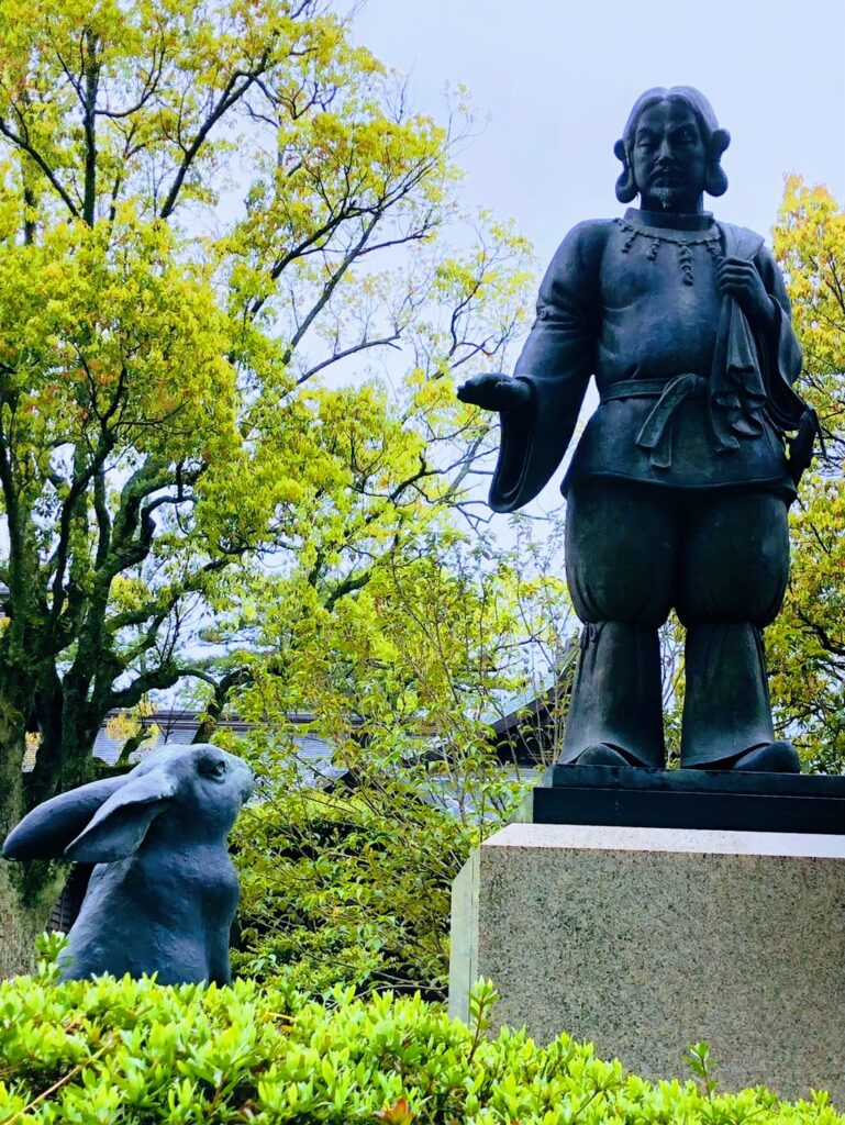 〈御自愛の御神像〉 出雲大社拝殿前の銅鳥居に近い辺りの松の参道左横に鎮座する像が「御自愛の御神像」です! 荷物を背負った「大国主神(おおくにぬしのかみ)」が傷ついた「兎」に、手を差し伸べている場面です。出雲に古くから伝わる神話「因幡の白兎(いなばのしろうさぎ)」を表現しています。