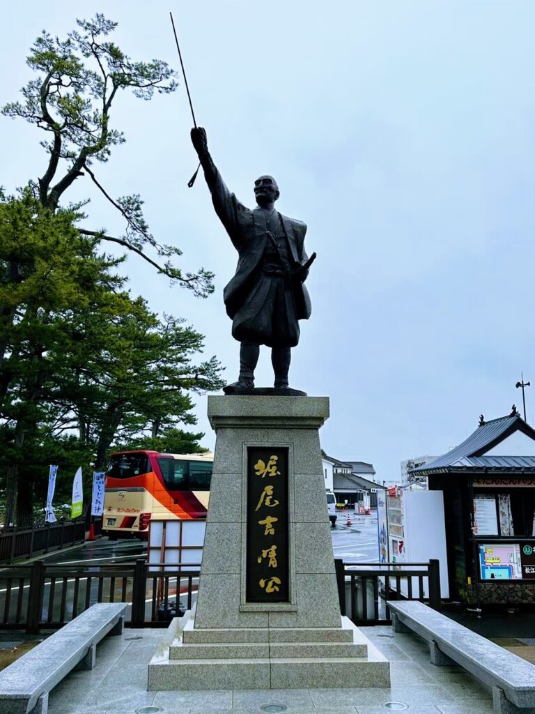 〈松江城築城の祖・堀尾吉晴(よしはる)」の銅像〉 さあ、ホテルをチェックアウトし、タクシーで向かった先は 『国宝 松江城』です! 入り口で迎えてくれるのは、戦国武将として名を馳せた「松江城築城の祖堀尾吉晴(よしはる)」の銅像です。 その息子・忠氏(ただうじ)が、関ケ原の合戦で功績を挙げたことにより、堀尾氏は月山富田城(安来市広瀬町)に入り出雲国を治めていきます。 その後、息子の忠氏は立地や交通の便などが悪く、統治をより良くするため新城の築城を計画するが、計画段階で死去してしまいました。 息子の忠氏がまだ幼かったこともあり、その後は吉晴が後見として藩政を執り行ったそうです。 しかし、その吉晴も亀田山に、5年の歳月をかけ1611年(慶長16年)松江城を完成させた、その年の 6 月に死去してしまいます。 その後は、吉晴の孫・忠晴(ただはる)が初代城主となり、京極氏・、松平氏と松江城の歴史を繋いでいきまました。