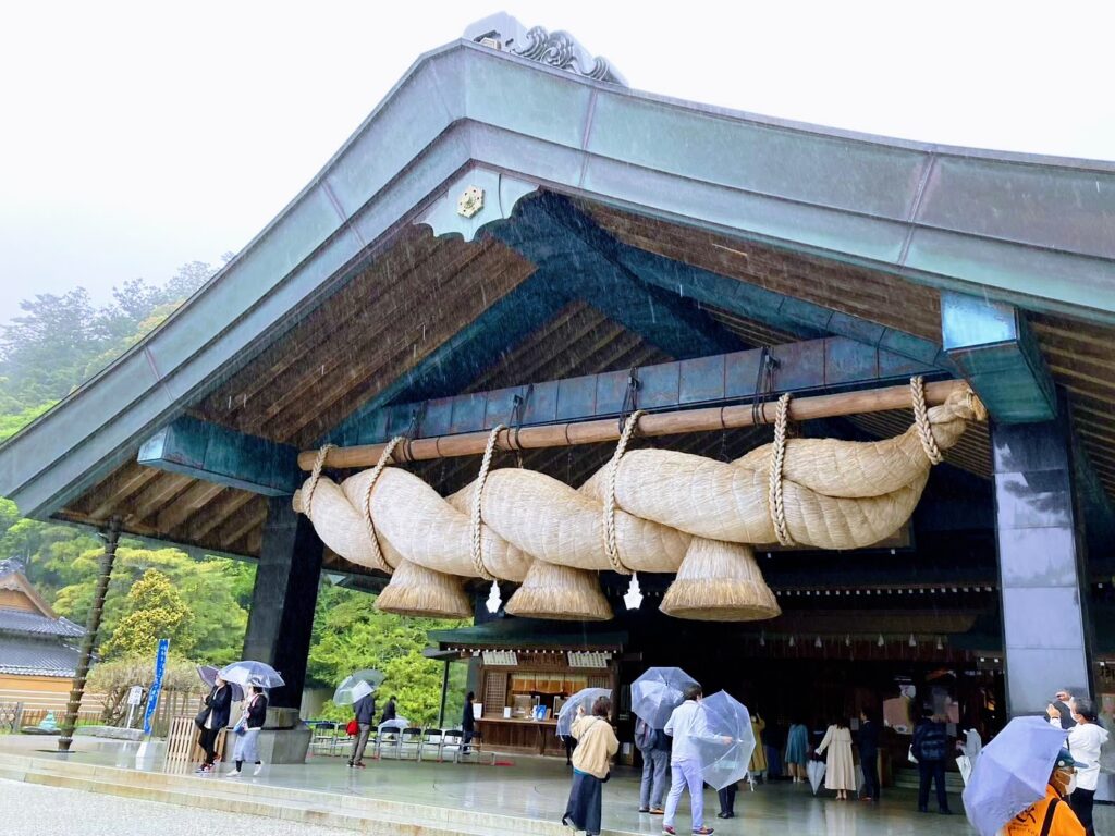 〈神楽殿〉 皆が知っている出雲大社といえば、こちらですよね! 昭和56(1981)年に造営され、祭典、祈願、結婚式などが行われます。 大広間は270畳式の広さがあり、神社建築には珍しく正面破風の装飾にステンドグラスが使われています。 正面には有名な日本最大級の大注連縄(長さ13.6m、重さ5.2t)があります。正面の大注連縄は長さ約13メートル、重さ5.2トンに及びます。この大注連縄は数年に一度、新しい注連縄へと懸け替えられるそうですよ!