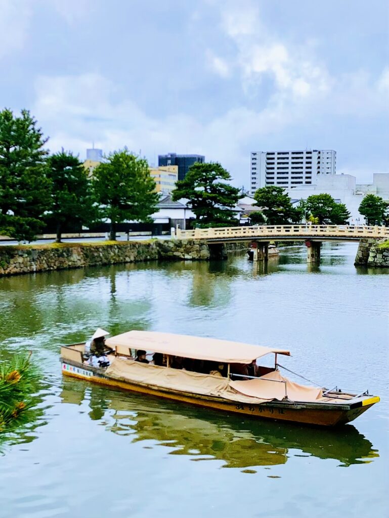 〈堀川めぐり〉 さあ、堀川遊覧船に乗ってみよう! 国宝松江城をぐるりと囲うお堀に浮かんで、 松江の町をゆったり進む小さな船。 船頭さんの合図とともに 気ままな船旅のはじまりです!!