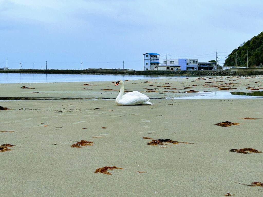 〈稲佐の浜に白鳥!?〉 レンタカーで移動し、稲佐の浜に到着しました。 稲佐の浜は、国譲り、国引き神話の舞台 として有名で出雲大社の西方1kmにある海岸です。 浜に降り立つと、変わった鳥の姿が目の前に! 良く見ると、白鳥です! 白鳥の姿が見えます!! 後に調べたところ、この白鳥、数年前から住み着いても居るそうです! 野生の白鳥は、冬に渡ってきますが、春には、再びシベリアなどに帰っていきます。 住み着いている白鳥は、居心地が良くて、餌付けされたようです。 遠くまで飛ぶのが嫌になったんでしょうか?(笑)