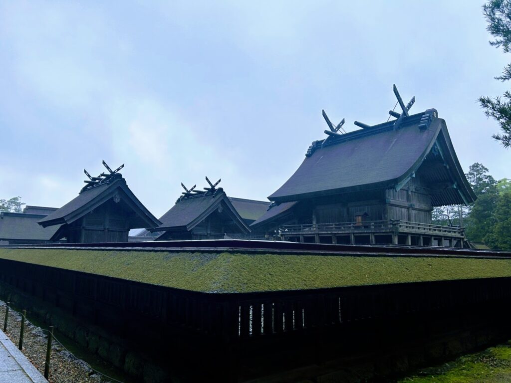 〈ご本殿〉大社造りと呼ばれる日本最古の神社建築様式。1744年(延享元年)に再建されたもので、平成の大遷宮で大屋根や千木などが新装されました。高さは約24m、厚い桧皮葺きの屋根の棟の上には長さ7.9mの二組の千木が交差しています。 御神体は稲佐の浜のある西の方角を向いて鎮座されており、本殿正面からは神様を横から参拝する形になります。