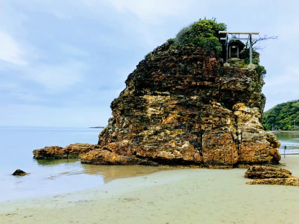 〈弁天島〉 稲佐の浜に一際目立つ島があります。 地元では「べんてんさん」と呼ばれて親しまれている島で、かつては稲佐湾のはるか沖にあったため、沖ノ御前、沖ノ島と呼ばれていたそうです。また、 昭和60年前後までは、島の前まで波が打ち寄せていたそうですが、近年急に砂浜が広がり、現在では島の後まで歩いて行けるようになりました。 神仏習合の頃には「弁財天」が祀られていましたが、明治のころから豊玉毘古命(とよたまひこのみこと)が祀られています。 しっかりとお参りし、稲佐の浜の砂を頂きました。