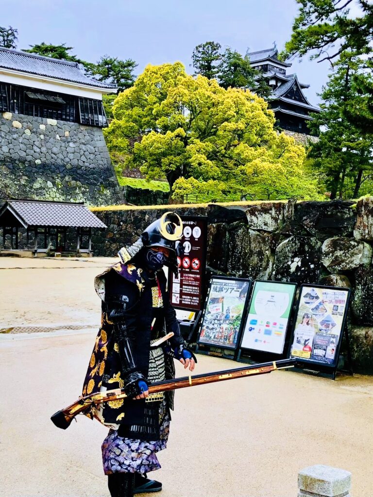 〈まつえ時代案内人〉 松江城入り口で、『まつえ時代案内人』の方に記念撮影して頂きました!!雰囲気抜群の武将姿が恰好が良いですね!! 『まつえ時代案内人』は、松江城に由来する武者や忍者の恰好の案内人が、「天下一やさしいお城ガイド」を合言葉に、戦に対する備えの粋をこらした城郭を、攻める目線、守る目線にてガイドしてくれます! また、築城から400年を越える松江城の、国宝の決め手となった当時の革新的な築城技術も紹介してもらえるのですが、今回は時間の都合もあって、記念撮影だけお願いしました!!
